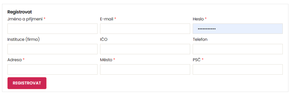 Zde budete vyplňovat pouze fakturační údaje. Součástí registrace je také vyplnění hesla, které budete používat pro přihlášení do systému. Heslo musí obsahovat velká a malá písmena, číslovky a speciální znaky.