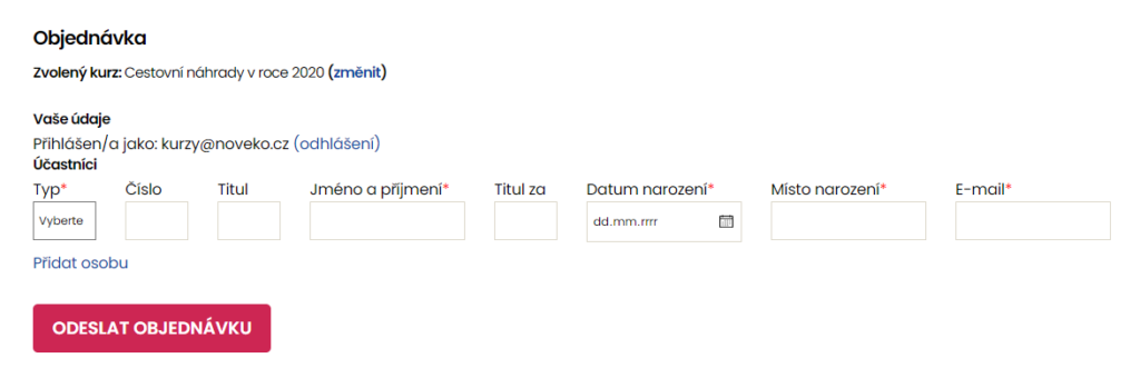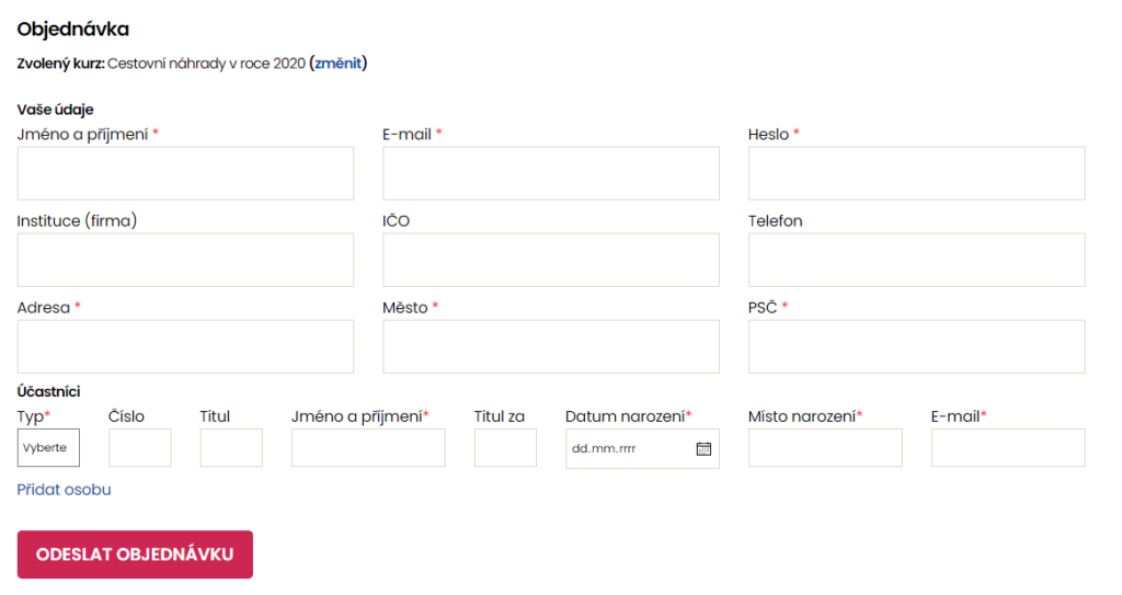 Zobrazí se přihlašovací formulář, kde vyplníte jména účastníků, včetně všech povinných údajů.