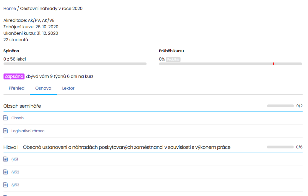 Po kliknutí na zakoupený kurz se Vám zobrazí obsah semináře.