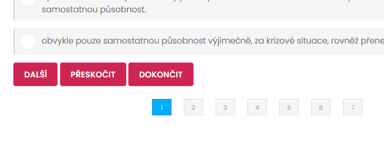 Pro přesun na následující otázku prosím používejte tlačítko další. V případě kliknutí na číslo otázky v dolní části, bude otázka označená jako přeskočená.